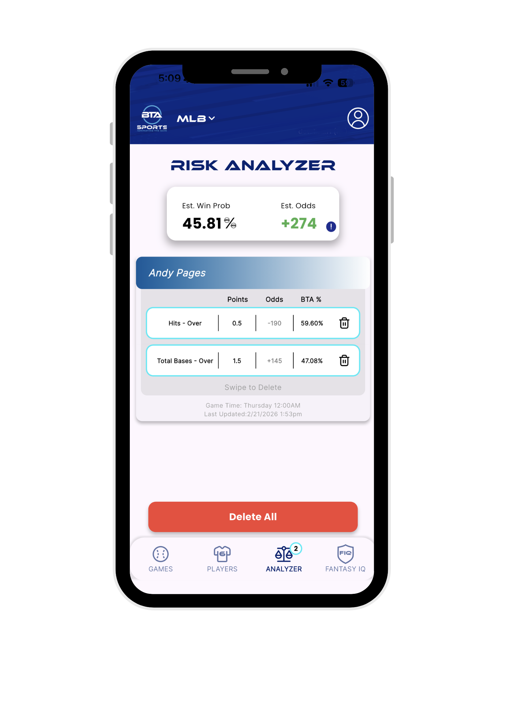 BTA Sports is an AI-powered sports analytics platform that helps bettors make smarter decisions using real-time probability models. Analyze matchups, explore player props, compare projections against sportsbook lines, and track risk across your bets — all in one interactive platform.
